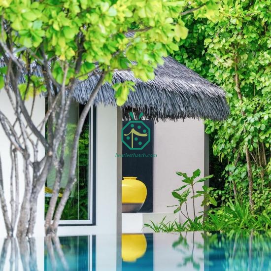 Nosso designs exóticos de telhados de palha Nossas cabanas de nipa são resistentes ao vento e à chuva e permitem a saída do ar quente, proporcionando um espaço fresco e sombreado. Se você já possui uma cabana de nipa, provavelmente ela é um elemento importante no seu quintal. Se você precisa construir uma nova, entre em contato conosco. estrutura de telhado de palha ou faça reparos em telhados de palha Você pode usar nossas telhas de palha sintética para coberturas de telhado ou para substituir qualquer dano em sua estrutura de madeira e refazer o telhado de sua cabana de nipa com nossos produtos. telhado de palha falso materiais.