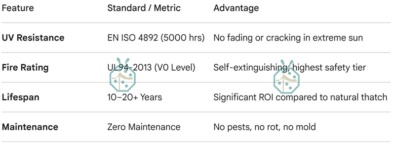 Unmatched Weather Resistance (Tested for 5000+ Hours) Tropical sun and salt spray are the ultimate tests for any roofing material. Our artificial tiki thatch roof products have undergone rigorous EN ISO 4892 testing for 5000 hours. This ensures that even after years of intense UV exposure in equatorial regions, your Tiki Hut maintains its color, structural integrity, and natural appearance.